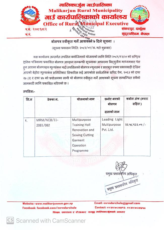 » बोलपत्र स्वीकृत गर्ने आशयको सूचना ।