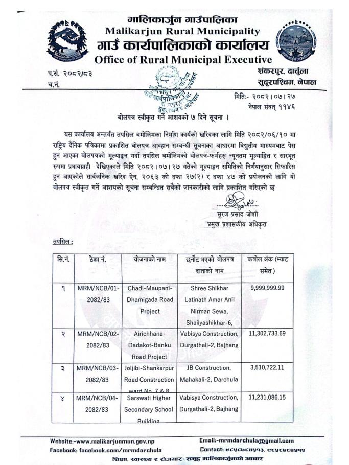 » बोलपत्र स्वीकृत गर्ने आशयको सूचना ।