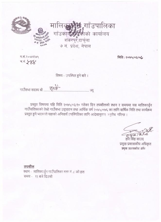 मालिकार्जुन गाउँपालिकाको तेस्रो गाउँसभा उद्घाटन तथा आर्थीक वर्ष २०७५/०७६ का लागि वार्षिक निति तथा कार्यक्रम प्रस्तुत हुने भएकाले यहाको उपस्थितिका लागि अनुरोध छ ।