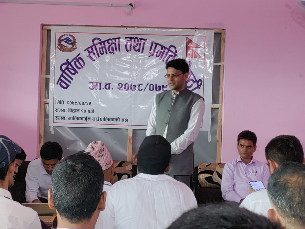 मालिकार्जुन गाउँपालिकाकको आ.व. २०७८।०७९ को वार्षिक समिक्षा तथा प्रगति गोष्ठी सम्पन्न भएको छ । समिक्षा गोष्ठीमा गाउँपालिका अन्तर्गतका सम्पूर्ण विषयगत शाखा तथा वडा कार्यालयहरुबाट आ.व. २०७८।०७९ मा सम्पन्न गरेका योजना कार्यक्रम।क्रियाकलापहरुको प्रस्तुतिकरणका,असल अभ्यास,समस्य तथा चुनौतिहरुका बारेमा गहन छलफल गरिनुसा साथै चा.लु. आ.व. २०७९।०८० को कार्ययोजना समेत प्रस्तुत गरिएको छ ।